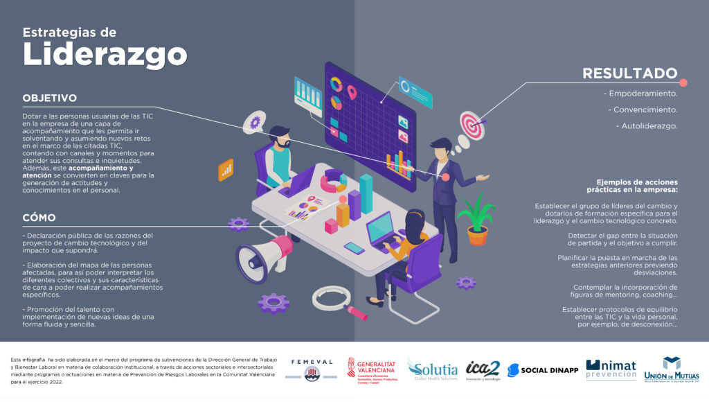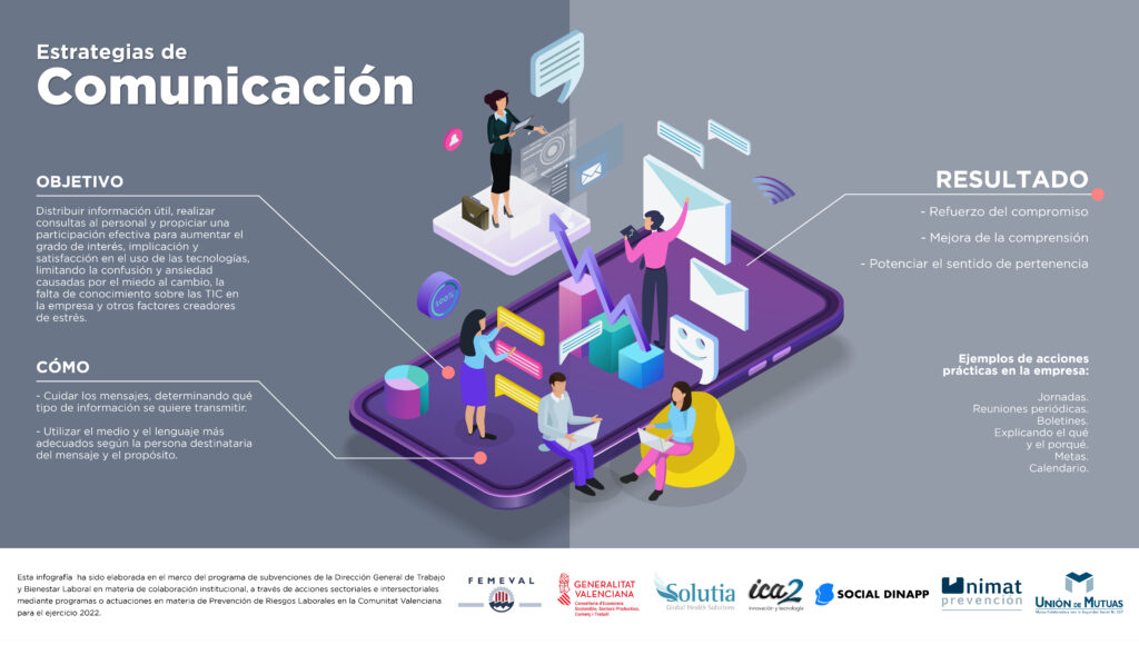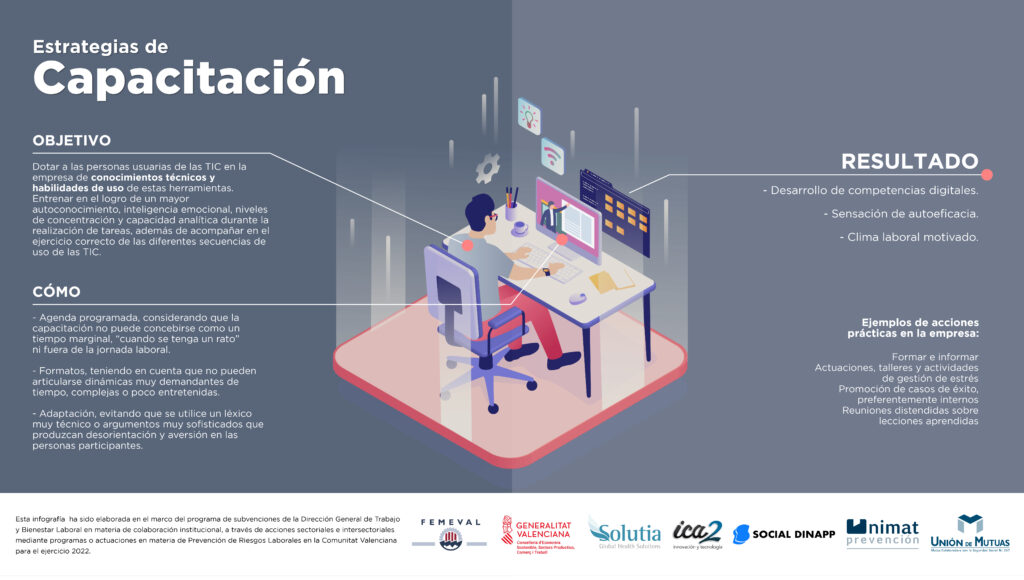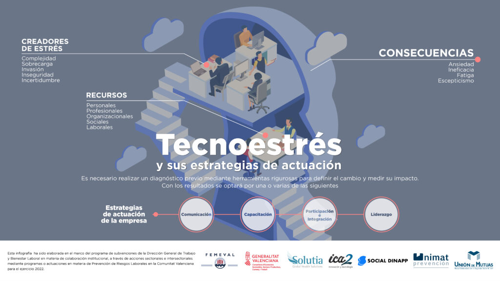 Asimismo, persigue establecer una metodología innovadora que aborde la prevención y gestión del tecnoestrés y los riesgos psico-sociales asociados a la incorporación de las TIC en las organizaciones.